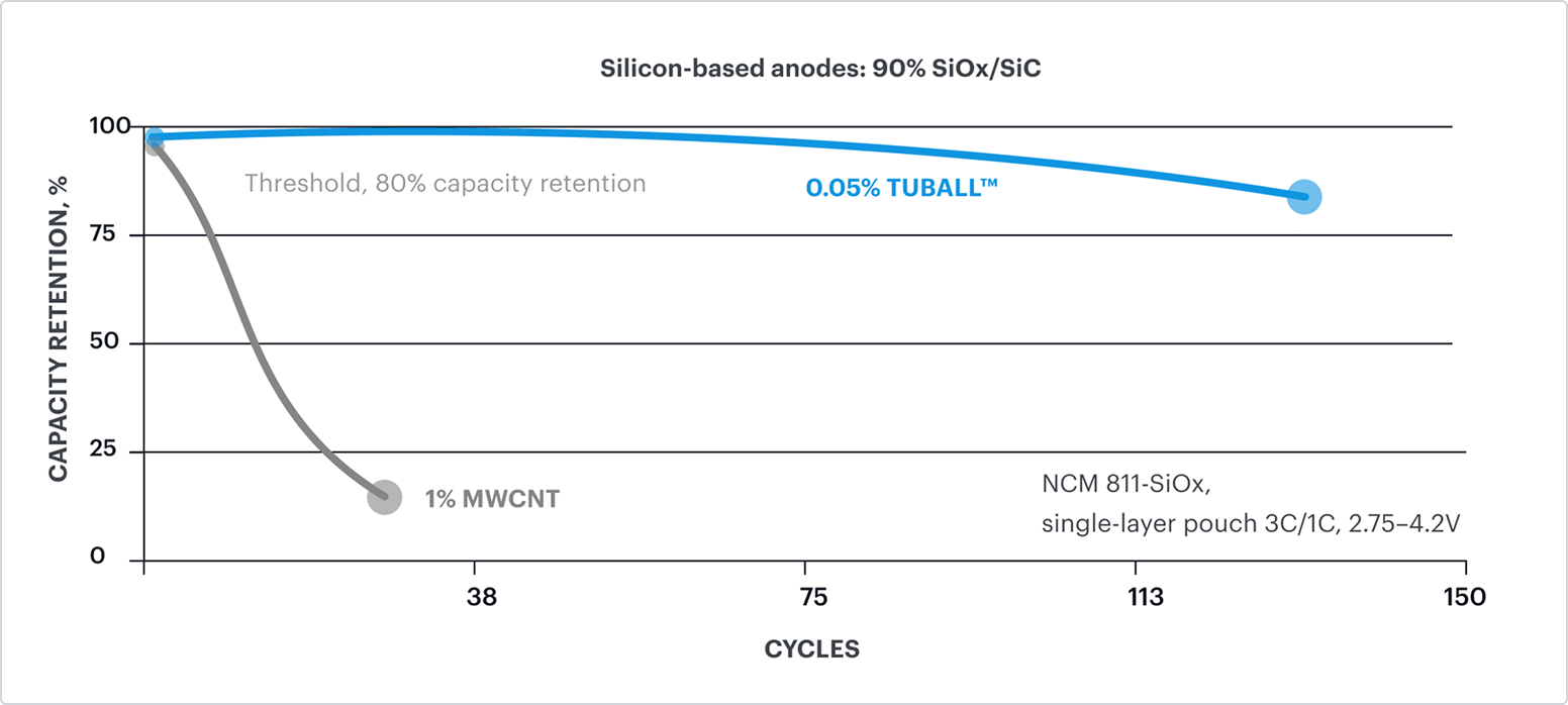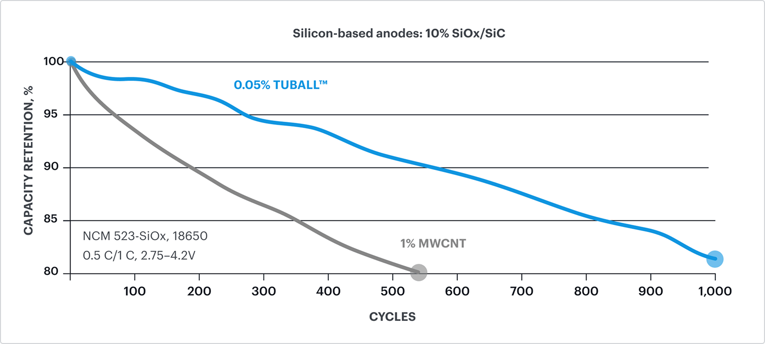 TUBALL™ single wall carbon nanotubes set a new industry benchmark in silicon anode performance. By forming a robust, long-lasting conductive network, TUBALL™ bridges silicon particles and prevents the structural degradation caused by silicon’s natural volume expansion and cracking during cycling.